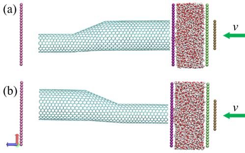 同时,许骏教授(第一通讯作者)及其团队成员胡大勇讲师、硕士生江汉林同学,与美国密歇根州立大学Prof. Weiyi Lu(共同通讯作者)合作提出以异型碳纳米管做载体的新型纳米流体能量耗散系统并揭示其能量耗散机理。冲击条件下,水池压力达到临界值时,水分子会克服毛细管阻力渗入疏水的碳纳米管中。在这个过程中,冲击能量转换为剩余表面能。许骏教授团队通过大量的分子动力学数值研究证明,该系统相较于国际上现有直管型纳米流体能量转换系统而言,具有更好的可控性、现实性以及轻量化。此研究结果已被该物理化学领域TOP期刊Physical Chemistry Chemical Physics收录(影响因子IF=4.5,在JCR原子物理分区排名6/34)。